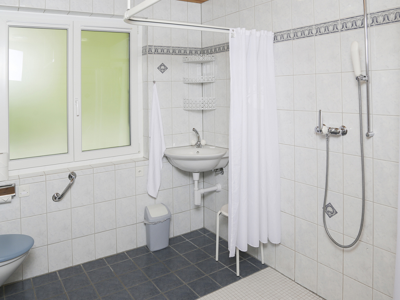 - Badezimmer mit Dusche und Badewanne, Waschbecken und WC. Das Bad ist rollstuhlgängig. Zudem zwei weitere, separate Toiletten