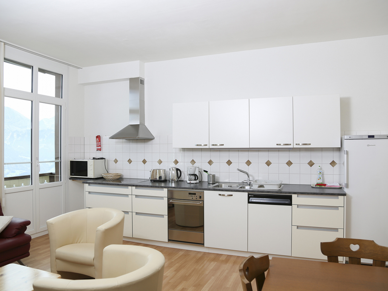 - Freundliche Wohnküche mit Backofen, Mikrowelle, Geschirrspüler, Kaffeemaschine Nespresso (Kapseln können an der Réception gekauft werden), Filter-Kaffeemaschine (Filter 1×4), Toaster und Wasserkocher, zudem Sofaecke, Kabel-TV, DVD, Radio, ein grosser Esstisch für 10 Personen